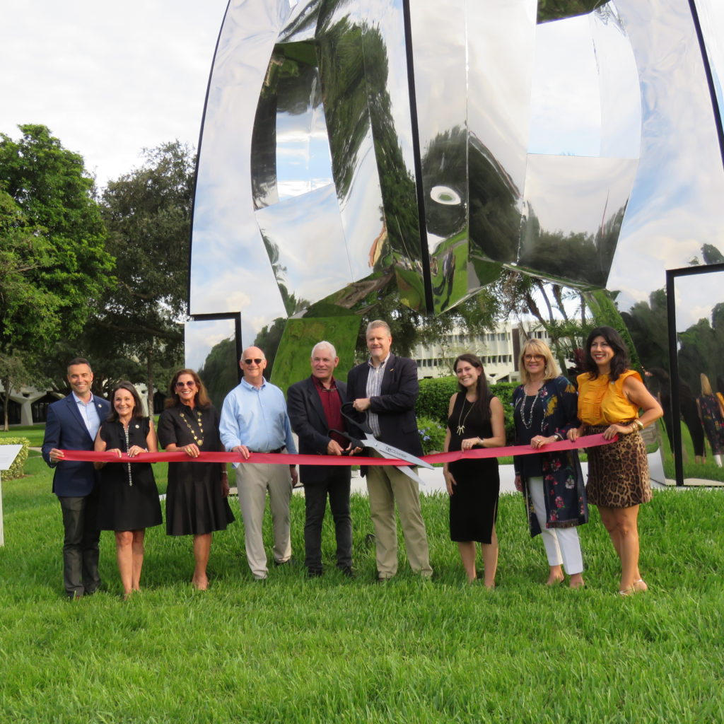 Ribbon Cutting on “Rocket:” Councilman &  CRA Vice Chair Andy Thomson, Vice Mayor Andrea Levine O’Rourke, Boca Raton Museum of Art Board Chair Jody Harrison Grass, Boca Raton Museum of Art Executive Director Irvin Lippman, artist Hubert Phipps, President & CEO of the Greater Boca Raton Chamber of Commerce Troy M. McLellan, Marketing Director for CP Group Giana Pacinelli, councilwomen Monica Mayotte & Yvette Drucker.